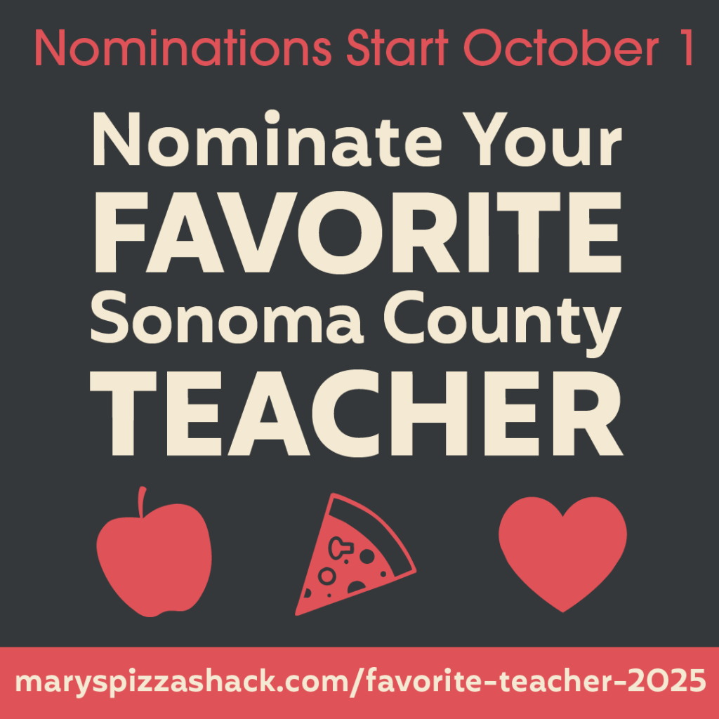 Mary’s Pizza Shack is proud to celebrate the incredible teachers in our community. From October 1–14, we invite you to nominate a teacher who has made a difference in your life or the lives of others. Share their name, school, and a short note about why they deserve recognition. Prizes: 1 Grand Prize Winner – $1,000 cash prize + a pizza party for their class (up to $250 value). 2 Runners-Up – $500 cash prize each + a pizza party for their class (up to $250 value). After nominations close, our Mary’s Family will review submissions and select the Top 10 Teachers. From October 22–28, the community will vote to decide the winners. The big announcement will be made on October 29! Help us honor the teachers who inspire, support, and shape the future of Sonoma County—nominate your favorite today!
