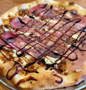 Prosciutto, fig preserves, mozzarella, provolone and gorgonzola cheeses, and a balsamic reduction