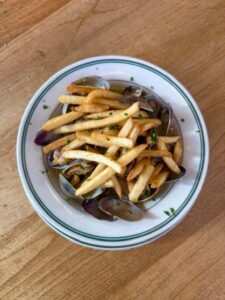 One pound of fresh manilla clams sauteed with fresh garlic, herbs, butter, white wine, fresh lemon and Italian parsley, garnished with a serving of French fries.